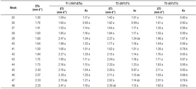The potential evapotranspiration (ETo) measured with an atmometer was 1.83 mm, while the ETo for the type A tank was 2.14 mm. Crop's evapotranspiration (ETc) determined with the atmometer ETo from week 35 to 48 was 1.68. The crop evapotranspiration with lysimeter (ETi) for T3 (1.65 mm) was significantly different (P<0.05) to T2 and T1 (1.99 and 2.05 mm, respectively). In the T1 treatment, the ETi and ETo of the atmometer and the type A tank were similar, ranging 2.05, 1.83 and 2.14 mm, respectively; thus, the ETo was adjusted to the water needs of the crop.
