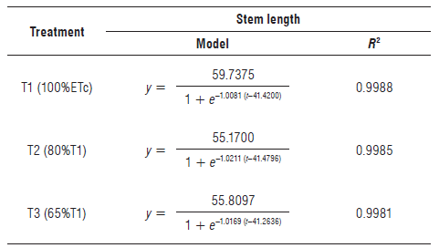 The growth of the floral stem was adjusted to a logistic model, showing the characteristic sigmoidal trend that allows the strategies planning for the crop production. The largest length values were 59.74, 55.17 and 55.81 cm for T1, T2 and T3, respectively, achieving this growth in 41 weeks.