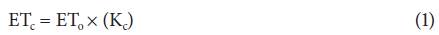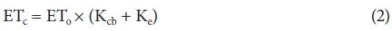 where ETc is the evapotranspiration of the crop (mm), ETo is the reference evapotranspiration (mm), Kc is the coefficient of cultivation or single coefficient, Kcb is the coefficient of transpiration and Ke is the coefficient of evaporation.