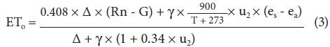 where ETo is the reference evapotranspiration (mm d-1), Rn is the net radiation on the crop surface (MJ M-2 d-1), G is the soil heat flux (MJ M-2 d-1), T is the average air temperature at 2 m height (°C), u2 is the wind speed at 2 m height (m s-1), es is saturation vapor pressure (kPa), ea is the actual vapor pressure (kPa), es-ea is the vapor pressure deficit (kPa), Δ is the slope of the vapor pressure curve (kPa °C-1), the psychrometric constant (kPa °C-1).
