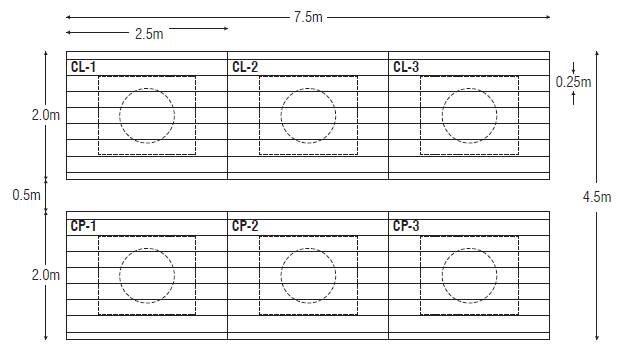 A complete block design was implemented with two treatments (CP and CL varieties) and three replicates, working an area of 34 m2 distributed in six experiment units (EU) of 5 m2 (2.5 m x 2 m), as shown in Figure 1. Because of the lack of germination uniformity in the third replicate of CP, this EU was ruled out in the follow-up and analysis.