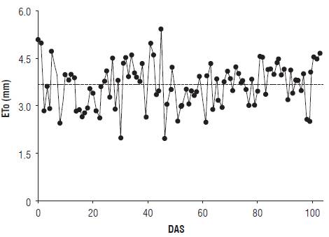 From the climatic variables measured in the field with the Campbell station, the daily ETo was calculated along the crop using Equation 3. On average, the ETo was 3.7 mm d-1. However, as expected, the evapotranspiration of the reference surface had abrupt changes from one day to another because of the variation of weather conditions in the area (Fig. 2).