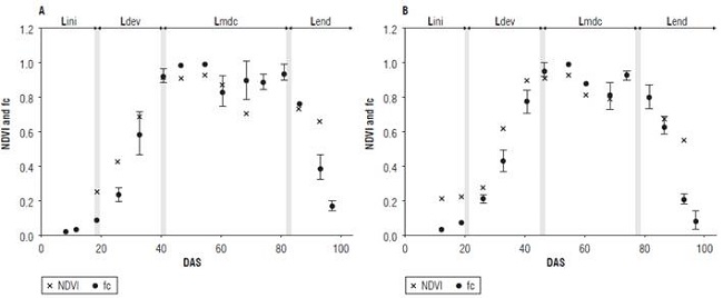 Figure 3 shows the evolution of fc and NDVI for each variety as well as the development stages established under the following criteria: The initial stage (Lini), starts from sowing and ends when fc is around 0.10, when the crop is in the middle of exponential growth, and its presence begins to exert changes in the response of NDVI. The middle stage (Lmdc) is maintained while the fc is above 0.90; after this point, the NDVI reduces sensitivity to the point of saturation (Odi et al., 2013). As for the final stage (Lend), it starts with values of fc lower than 0.90; the NDVI generates a response to photosynthetically inactive tissues, maintaining distant values for fc.