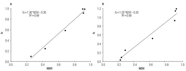On the other hand, the correlations between NDVI and fc, before the tutoring, were 0.99 for CL and 0.96 for CP (Fig. 2), according to what was reported by Calera et al. (2005), González (2006), Er-Raki et al. (2007), López et al. (2009) and Johnson et al. (2012).