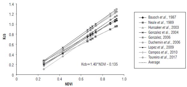 The values obtained for Kcb are shown in Figure 5, with the different NDVI-Kcb approximations reported in the literature and presented in the Table 1, using the values of NDVI obtained in the present study. In this figure, it is observed that the standard deviation of the estimated Kcb was small despite the physiological and morphological differences of the various crops of agricultural importance, with values of 0.05 for NDVI near bare soil and 0.11 close to total plant cover.