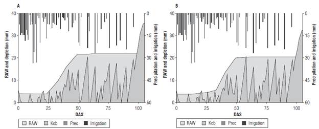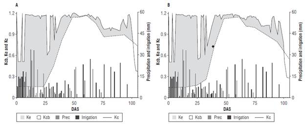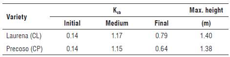 Based on the Kcb average equation, water vapor liberation was maintained through the estomatic aperture in relation to the increase of the exposed plant superficial area and the aerodynamic resistance. For this reason, higher transpiration levels appeared in the mid-stage (Tab. 3).