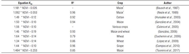Worldwide, the VI with greater impact and expansion in remote sensing is the Normalized Difference Vegetation index (NDVI) (González, 2006). This index is characterized by results between -1 and 1; when photosynthetically active vegetation densities are high, the NDVI is close to 1. However, for bare soil surfaces, this index is close to zero and takes on negative values for water bodies or cloud cover. One of the advantages and reasons for the great acceptance of NDVI is the simplicity and ease of applying it to intermediate canopy covers (Gilabert et al., 2010). Its high correlations with biophysical variables, such as Kcb (Tab. 1) and the plant cover fraction (fc) (González, 2006; Er-Raki et al., 2007; López et al., 2009; Johnson et al., 2012; Zhang et al., 2015), have allowed for its implementation in studies on water balances in large land surfaces.