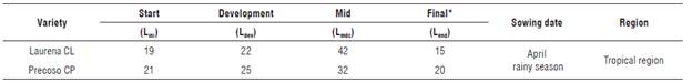 Climatic information was obtained with the use of a Campbell scientific automatic meteorological station installed on a reference surface of grass or festuca, which recorded data of relative humidity, wind velocity, solar radiation, precipitation and temperature every 10 min. For the days without information from July 2 to 6 (41 and 45 DAS), the information from a near station, belonging to the CENI-CAÑA automated meteorological network, was used.