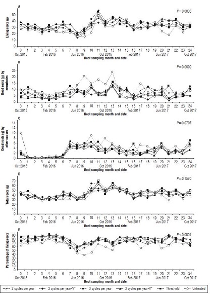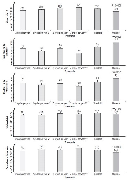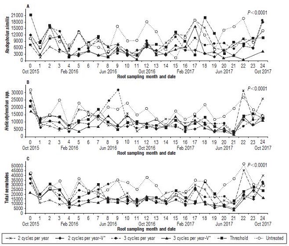 Root content and nematode populations through the 25 samplings are presented in Figures 1 and 2. Across the different samplings, root content and nematode populations followed a similar trend in all the treatments. After treatments application, when comparing the average of the 24 samplings (Fig. 3), differences were found among treatments in the contents of living roots (P=0.0003) and dead roots by nematodes (P=0.0009). The highest increase in living roots was observed in plants treated with three nematicide cycles per year with 21 and 17%, followed by the plants treated according to the economic nematode threshold of 2,500 plant-parasitic nematodes per 100 g of roots, which resulted in four applications per year with 16% (Fig. 3A) compared to untreated control. The application of nematicides reduced the dead of roots by nematodes between 20 and 46% (Fig. 3B). In agreement to the increase of roots in plants treated with nematicide and their lower dead of roots by nematodes, these plants had the highest (P<0.0001) percentage of living roots, which varied between 74.6 and 81.7%. These results contrast the 67.3% found in the untreated control plants (Fig. 3E). The grams of dead roots by other causes (P=0.0707) and total root (P=0.1570) weight were similar among treatments, ranging from 2.2 to 3.4 g, and from 41.2 to 44.9 g per sucker, respectively (Fig. 3C-D).