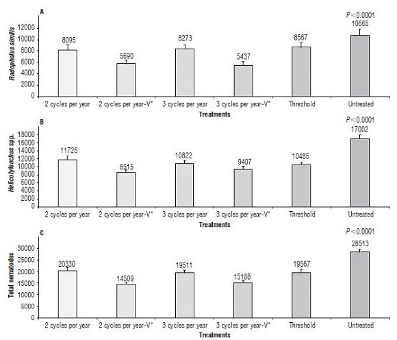 The biggest nematode population per 100 g of roots of R. similis (P<0.0001), Helicotylenchus spp. (P<0.0001) and total nematodes (P<0.0001) was found in the untreated plants (Fig. 2 and Fig. 4). Compared to the untreated plants, nematicide treatments reduced R. similis between 20 and 49%, Helicotylenchus spp. between 31 and 50%, and the total nematode populations between 29 and 49% (Fig. 4A-C). Changes in the nematode population composition were observed by averaging the 24 samplings taken after treatment applications, with R. similis increasing to 45.8%, Helicotylenchus spp. decreasing to 52.2%, and Meloidogyne spp. and Pratylenchus spp. remaining negligible with 1.4% and 0.4%, respectively (data not shown).