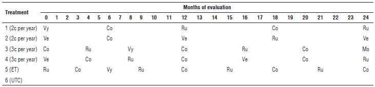 Six treatments were evaluated: 1 and 2 consisted of two different nematicide rotations per year; 3 and 4 consisted of three different nematicide applications per year; 5: nematicide application based on nematode economic threshold of 2,500 plant-parasitic nematodes per 100 g of roots (INIAP, 2018), and 6: the untreated control. The applied nematicides were those available in Ecuador, including Counter® 15GR (terbufos-AMVAC), Verango® 50SC (fluopyram-Bayer), Vydate® 24SL (oxamyl-DuPont), Mocap® 15GR (ethoprophos-AMVAC) and Rugby® 10GR (cadusaphos-FMC) (Tab. 1).