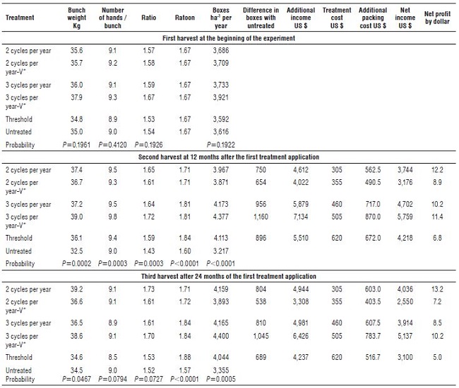 The highest number of boxes per hectare per year was due to the application of nematicide that resulted in a significant reduction of nematodes, which led to an increase in the percentage of living roots that favored water and nutrients uptake. This, in turn, allowed a better growth of the crop, which led to higher bunch weights, ratio, and ratoon. In the second and third harvest, nematicide treatments produced from 671 to 1,158 (12.2 to 21.0 t) and from 545 to 1,046 (9.9 to 19.0 t) more boxes of 18.14 kg per hectare per year than plants of the untreated plots, at 12 and 24 months of the treatment application, respectively. This means that nematode control increased production between 21 and 36% and between 16 and 31% at 12 and 24 months of treatment application, respectively. The smallest increases in production, 24 months after applying the treatments, probably indicate the proximity of the optimum yield; at that point, maintaining adequate control of the pest would stabilize the production, until the natural senescence of the crop begins.