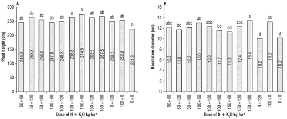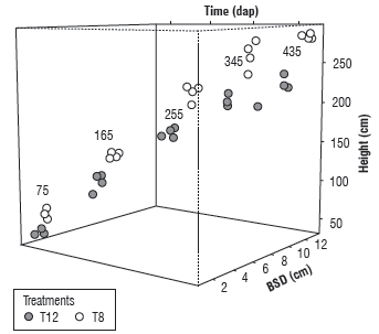 A three-dimensional diagram indicated the simultaneous relationship between variables Hp and BSD as a function of fertilizer rates and moments of evaluation (Fig. 2). Two treatments contrasting in Hp and BSD behavior, such as absolute control and N=150 kg ha-1 plus K2O=120 kg ha-1 (Tab. 3 and Fig. 1), were used in the diagram. It showed progressive increases in each variable in time and confirmed that plants were taller and thicker when treated with NK, while the lowest Hp and BSD were observed in absolute control without NK fertilization (Fig. 2). The highest dispersion in variables Hp and BSD occurred in the reproductive phase of growth at 345 and 435 DAP. Both variables possessed a similar growth pattern over time, as shown by Reis et al. (2018), but stood out in the treatment with the highest rate of N (150 kg ha-1) at 345 and 435 DAP. The diagram of dispersion did not reflect a trend, since the variable "treatments" was of nominal scale; however, an increasing trend in time for Hp and BSD could be observed for both treatments (Fig. 2).