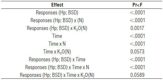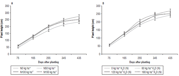To evaluate the effect of N and of K2O doses nested in N (K2O(N)) on Hp and BSD at different moments of growth, Wilks' Lambda statistics was used. It revealed the interactions of second and third order, both significant (P<0.05) and highly significant (P<0.01) for the main effects associated with doses of N, doses of K2O nested in N, and evaluation moments (Tab. 4). In order to use the results of the bivariate analysis of variance, it was necessary to recognize the presence of significant interactions; these interactions made it impossible to interpret the main effects (Tab. 4), so that one could appeal for the graphs of interaction (Sokal and Rohlf, 2012). Table 4 presents the summary of the two-way ANOVA of repeated measures design of some of the effects. It highlights the interactions and justifies the use of interaction profiles to select the best N doses at each evaluation time. Table 4 shows the effects of the reduced model eliminating effects with a significance level greater than 5%. The values close to 5% were left in the model, although they were higher than this limit. In double interactions of inter-subject factors with "time", the effect of K2O(N) could be interpreted, since the interaction was not significant (P=0.0589) (Tab. 4). In the absence of a significant interaction between "time" and "dose of K2O nested in N", the values of Hp and BSD at 435 DAP corresponded to 266.7 and 12.2 cm, respectively, for 180 kg ha-1 K2O nested in different N doses, while control plants had Hp of 239.1 cm and BSD of 11.2 cm. As for the effect of N, the interaction of "N dose" with "time" was revealed. This makes it impossible to select the best dose of N for all moments, so that the use of profiles facilitated choosing the best dose at each evaluation time (Figs. 3 and 4).