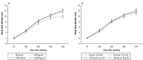 Five destructive plant samplings (45 d after each fertilization) were carried out at 75, 165, 255, 345, and 435 DAP. Four plants were evaluated in each treatment for a total of 48 plants at each sampling moment. The plants were cut at soil level and plant height (Hp) was measured (cm) from the stem base at soil level to the apex of the principal orthotropic stem. Basal stem diameter (BSD) was measured at the base of the principal stem with an electronic digital caliper (Mitutoyo Absolute Digital Caliper 500-197-20, Japan).