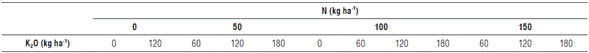 Considering the soil characteristics and responses to fertilizer applications reported for J. curcas in earlier studies (Patil and Parameshwarappa, 2007; Kalannavar et al., 2009; Suriharn et al., 2011), the doses of fertilizers were established between 0 and 150 kg ha-1 per year for N and between 0 and 180 kg ha-1 per year for K2O. These doses were arranged in a scheme comprising 12 treatments including control treatments with either N or K applied and an absolute control without NK application (Tab. 2). The sources of fertilizers were urea and potassium chloride. Other mineral elements were applied pre-transplant in equal doses for all treatments: 46 kg ha-1 P2O5, 44 kg ha-1 Ca, 18.8 kg ha-1 Mg, 27.2 kg ha-1 S, 3.18 kg ha-1 Mn, 2.4 kg ha-1 Zn, and 1 kg ha-1 B.