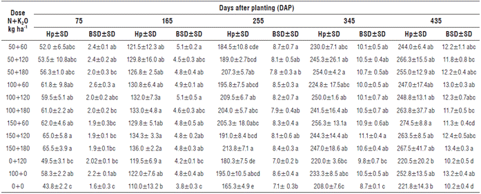 Statistical analyses involved descriptive and inferential components using bivariate and univariate approaches. Initially, descriptive statistics (mean, standard error of mean, and standard deviation) for Hp and BSD were applied for each treatment and each moment of evaluation associated with factors of N and K2O doses. A three-dimensional dispersion diagram visualized Hp and BSD at each evaluation time for two contrasting treatments, absolute control and a treatment combining high rates of N (150 kg ha-1) and K2O (120 kg ha-1). The experiment involved a repeated measures design with inter-subject factors of fertilization rates (K2O dose was nested in N dose due to the origin of the K2O dose, so that different levels of the K2O factor shared a single level of the N factor) and an intra-subject factor of evaluation time (75, 165, 255, 345, and 435 DAP) (Davis, 2002; Montgomery, 2013). The Hp and BSD were used as response variables. A bivariate analysis of variance was applied to adjusted linear model. P values less than 5% were considered significant but the effects with significance less than 10% were taken into account; this was done in order not to rule out any effect that might be significant in the model. With simultaneous confidence intervals of Bonferroni, the evaluation moments were compared using error bars, since it is usual in growth models to search for significant interactions between inter-subject factors and evaluation time. Comparisons using error bars were made on the response profiles for each factor (Cumming et al., 2007). To complement the descriptive analysis, bar diagrams for Hp and BSD were constructed at the end of the evaluation period (435 DAP), combining factors to generate a single label of "treatments". This was done to obtain information on the behavior of 12 treatments (Tab. 2) at the end of the experiment for each response variable separately; in this case, the Tukey's test (P<0.05) was applied to compare the mean values. Finally, a multiple regression model was fitted for each response variable (Hp, BSD) using as predictors the N and of K2O doses and the moments of evaluation; this was done only by predictive interest and not to compare the effects. With this, while setting the evaluation time to 435 d, a cross-table was generated to present the estimates of combinations of N and K2O doses that were not originally used in the experiment.