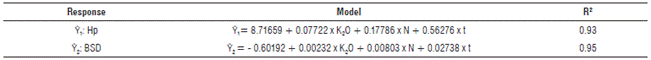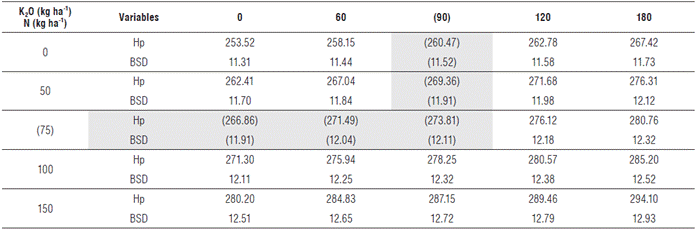 Employing the models obtained, the values of Hp and BSD for J. curcas at 435 DAP were estimated for different levels of N and K fertilizers. Also, randomly chosen and experimentally untested doses (N=75 kg ha-1 and K2O=90 kg ha-1) were introduced within the operational ranges of each dose to verify the predictive behavior of the models (Tab. 6).