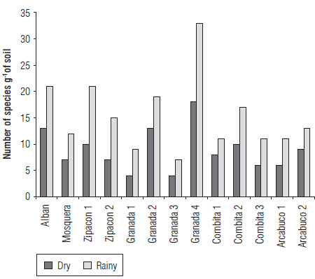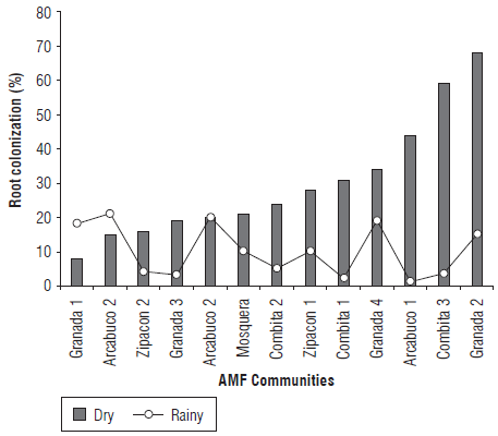 At the seasonal level, a high diversity in AMF communities was also observed, which was expressed as a higher number of spores, richness and relative abundance of species in the dry season compared to the wet season in which higher levels of root colonization were detected. Similar results have been obtained by several authors in the dry season (Pagano et al., 2013; Guadarrama et al., 2014; Rabelo et al., 2014) as well as in the wet season (Guadarrama and Álvarez-Sánchez, 1999). The seasonal variation of the communities was evident by the differences found in the number of species between the dry (46) and rainy (31) seasons, of which 32.6% of the species were not isolated in the rainy season. These results are in agreement with previous reports on seasonal variations of AMF communities (Courty et al., 2008; Davey et al., 2012; Bonfim et al., 2013; Guadarrama et al., 2014). Some authors have reported similar effects of the rainy season on root colonization to those obtained in the present study (Rabatin, 1979; Allen, 1983; Lodge, 1989; Miller, 2000; Miller and Sharitz, 2000), while other authors observed no effect (Bryla and Duniway, 1997; Ming and Hui, 1999). The presence of spores and the different levels of root colonization showed the existence of an active interaction between AMF and cape gooseberry plants in the Andean soils. The dry season increased the number of spores.