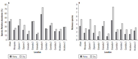The relative abundance exhibited higher values in the dry season than in the rainy season, related to the greater number of species collected and identified at that time. A relative abundance of more than 71% was obtained for the sample from G4, whereas for that same sample in the rainy season, only 60% was reached. The samples from G1 and G3 had the lowest relative abundances. It is evident that in C1, A2 and G2, the relative abundance of the species was higher in the rainy season, while in the other samples it was always higher in the dry season (Fig. 4).