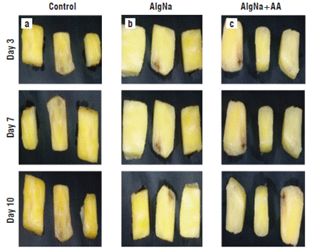 Coating-forming solutions based on sodium alginate (Al-gNa) and its blends with ascorbic acid (AlgNa+AA) were obtained. They were easy to prepare and handle and yielded a transparent and homogenous coating on the fresh-cut pineapple samples. Moreover, the coatings adhered well to the fruit and gave its surface a bright appearance (Fig. 1).