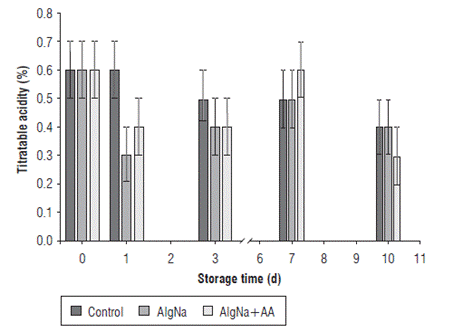 Figure 3 shows the behavior of pH of cut pineapple samples during storage. All samples showed a gradual increase in the pH with the passing of time until reaching pH values of around 4.11 at the end of storage (P<0.05). A decrease of around 38% in the initial values of titratable acidity was observed for all samples, obtaining titratable acidity values of 0.4% for control and AlgNa samples and 0.3% for the AlgNa+AA samples (P<0.05) (Fig. 4).