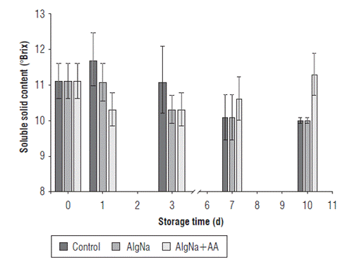 The behavior of the soluble solid content of uncoated and coated cut pineapple samples is shown in Figure 5. At the initial time, statically significant differences were not found between uncoated and coated samples (P<0.05) with values around 11 °Brix observed. With the passing of storage days, the uncoated and the coated samples showed soluble solid contents fluctuating between 10 and 12 °Brix during storage. At the end of storage, control and AlgNa samples exhibited a slight decrease in the values of soluble solid content, while in the AlgNa+AA coated samples, this parameter was similar to the initial one. It is well known that sugars are the most important components in soluble solids of fruits and that their concentration varies with the species, cultivar, maturation stage, and climate. Soluble solid contents from 7 to 14% have been reported for several pineapple cultivars (Dussan-Sarria et al., 2014; Pizato et al., 2019), and different behaviors have been observed in the soluble solid content of cut pineapple samples during refrigerated storage. For instance, Pizato et al. (2013, 2019), who worked with minimally processed peaches and pineapples, observed an increase in the soluble solid content of fruits with the passing of storage days. This result was attributed to the significant water loss suffered by the fruit, resulting in a concentration of total soluble solids.