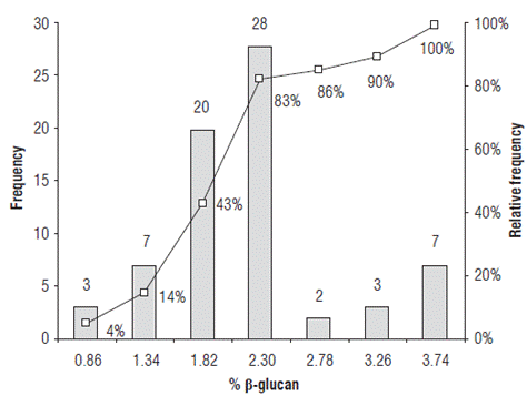 Barley accessions showed significant variability in β-glucan content with mean values from 0.38% to 3.74% (w/w) (Supplementary material 1). Twenty-eight of the accessions had a β-glucan content which ranged from 1.82% to 2.30% (w/w) and 86% of the evaluated accessions had β-glucan content below 2.78% (Fig. 1). The accessions with a β-glucan content lower than 2.10% (w/w) have the potential to be used in the brewing industry and in the animal feed industry for monogastric animals. In studies with chickens and rats, the main deleterious component of barley grain is the hydrocolloidal β-D-glucan. Probably because of the increase in the viscosity of the intestinal contents this causes poor performance for chicks (Griffey et al., 2010). β-glucans decreases the activity of endogenous enzymes, alters intestinal morphology and modifies microflora composition and activity, reducing nutrient digestion and absorption and increasing the susceptibility to disease (Jacob and Pescatore, 2014). The β-glucan contents of the remaining 32 cultivars and accessions were higher than 2.10% (w/w). Those in the range of 2% - 4% (w/w) can be used for animal feed, while those with β-glucan content higher than 3% can be used for human consumption, either consumed directly as cooked or roasted grain or processed as ingredients for different food products. Barley accessions with high β-glucan content can also be used as raw material for obtaining soluble dietary fiber (SDF) to enrich different foods. Barley bran, which is rich in β-glucan, can be incorporated into oriental noodles and pasta products. Consumption of cereal fiber, such as that from barley, has been shown to have an effect on cardiovascular health by reducing low-density lipoprotein (LDL) cholesterol by about 10-20%. In addition, cereal fiber helps to reduce blood glucose levels and provides a greater sense of satiety (Wood, 2007).