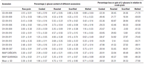 The aqueous cooking of barley grains caused a decrease of 39.9% in the β -glucan content of the 12 accessions evaluated compared to the β-glucan content of raw grain (Tab. 1). The accessions that had the greatest reduction compared to the raw grain were CH-09-011, CD-09-013, and CD-09-008, with a decrease of 58.5, 55.4 and 52.2%, respectively (Fig. 2). This could be attributed to the solubility of β-glucan in hot water. In contrast, the grain roasting process increased β-glucan content by 35.5% compared to the raw grain (Tab. 1). The accessions that showed a significant increase in β-glucan content with the roasting process were CD-09-013, CM-09-007 and CH-09-011, with a 60.9, 55.6 and 54.8% increase compared to the raw grain (Fig. 2). Roasting involves heat and mechanical shearing which may have affected the molecular and structural characteristics of β-glucans and their interaction with other barley components, thus having an impact on β-glucan content (Lazaridou and Biliaderis, 2007). The high temperatures during the roasting process may have also inhibited the activity of β-glucanases, so that β-glucan was not hydrolyzed and was present in higher concentrations (Lazaridou and Biliaderis, 2007).