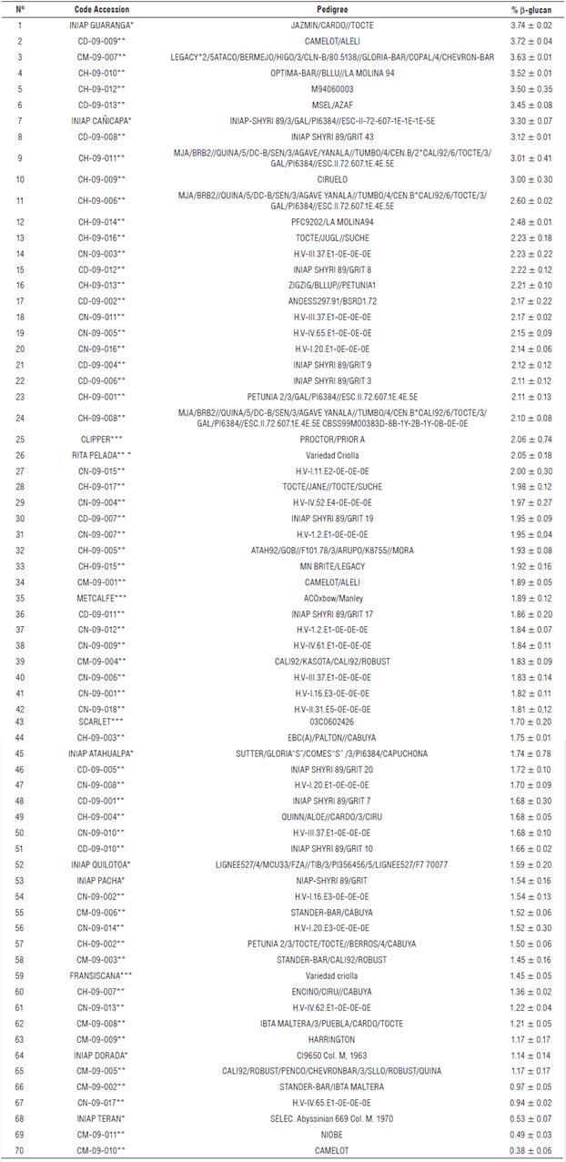 Cereals including barley (Hordeum vulgare L.) are the most widely consumed food group in the world, particularly in developing countries, due to their low cost and high energy content (Lopez et al., 2008). Indigenous groups of the inter Andean region of Ecuador have cultivated barley as far back as the third quarter of the sixteenth century. Barley was quickly accepted among the indigenous people of the Sierra and, although they had very good native crops, the barley grain was planted for use as food and for brewing (Patino, 1963). Most of the barley grain is used for human consumption, including traditional machica (toasted and ground barley flour) to make coladas (beverages) and pinol (a traditional hot drink of Ecuador made from a mixture ofmachica, panela and some sweet species), flour and baked bread, and as grain for preparing soups and desserts. In addition, barley is used in the malting industry for brewing and to a lesser extent as fodder for cattle (Villacres, 2008).Barley is an important source of vitamins, minerals, proteins, antioxidants and dietary fiber (Baik and Ullrich, 2008; Havrlentová et al., 2011). Dietary fibers in cereals are complex carbohydrates with ten or more monomeric units. These fibers are cellulose, hemicellulose, pectin, and β-glucans, among other compounds, and their structural differences determine their physical, chemical and physiological properties (FAO, 2010). β-glucans constitute approximately 75% of the cell wall of the endosperm of the barley grain (Sarwar et al., 2013). The structure of β-glucan has a significant impact on human health, specifically its effect of lowering total cholesterol and reducing the risk of cardiovascular diseases (Havrlentová et al., 2011). β-glucan has been shown to reduce postprandial glucose by increasing the viscosity in the upper digestive tract and providing a feeling of satiety sooner. A balanced diet rich in dietary fiber provides immense benefits to cardiovascular health, reducing between 10-20% the low-density lipoproteins (LDL). In addition, the rheological properties of β-glucans have promoted dietary fiber incorporation into different food with the aim of improving the stability, texture and shelf life of food products (Wood, 2007; Alminger and Eklund-Jonsson, 2008; Regand et al., 2011; Pizarro et al., 2014). The objectives of this study were to measure the β-glucan content of accessions in the seeds of Ecuadorian elite barley collection of the Instituto Nacional de Investigaciones Agropecuarias (INIAP), guide the use of accessions, establish the relationship among β-glucan, viscosity and dietary fiber and determine the effect of several industrial processes on β-glucan content.