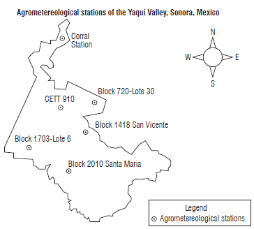 The experiment was carried out during the growing seasons of 2016-2017 and 2017-2018 (December-May) under field conditions using a calculus surface of one ha in seven representative sites in Yaqui Valley, Sonora, Mexico, where agro-meteorological stations belonging to the INIFAP (Instituto Nacional de Investigaciones Forestales Agrícolas y Pecuarias) are located (Fig. 1). These stations record the data of agroclimatic variables, mainly the temperature of the region.