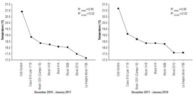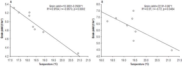 The temperature variation showed a negative and significative correlation with grain yield in both experiment crop cycles (Fig. 6). The observed general yield decrease was fit at 92% with the linear model used for the statistical process in the crop cycle 2016-17 and at 51% in the second crop cycle.