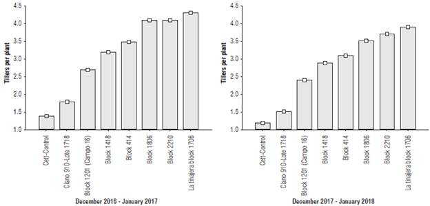 The tiller number was significantly reduced from four to one tiller in both evaluated crop cycles.