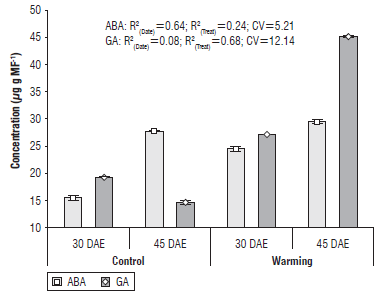 The warming caused a significant decrease in the ABA content and an increase in the GA, which corroborated its contribution to the wheat tillering capacity reduction in Yaqui Valley.