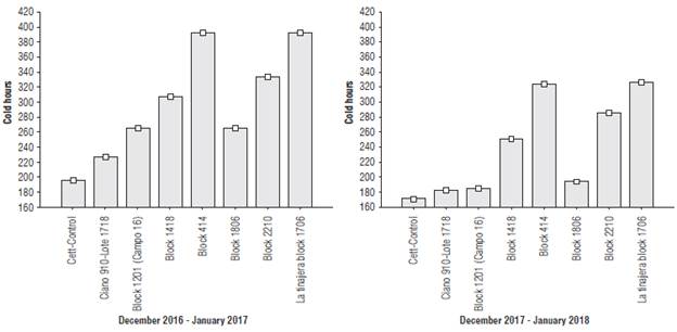 The temperature database was supplied by seven climatological stations located in the experiment sites. The digital memory of the meteorological station records readings every 10 min and provides integrated data by hour and day, averaging the temperature and calculating the thermal sum (heat hours, cold hours) with the maximum and minimum threshold temperature of 10°C and 0°C, respectively, following the methodology of thermal sums of Confalone and Navarro (1999). These data are available at http://www.siafeson.com/remas/index.php.