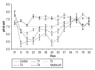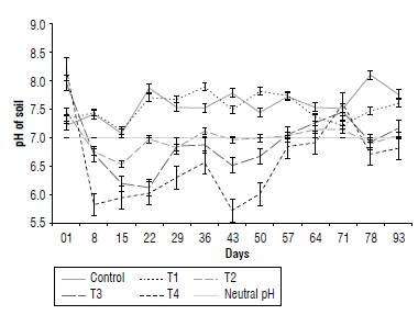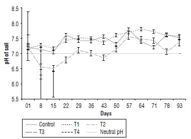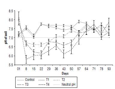 Soil pH in the control and Tj for corn was slightly alkaline during the time of the experiment. T2 remained slightly acidic until day 36, and then acidity increased. Treatments T3 and T4 were slightly acid pH until day 50 (Fig. 1).