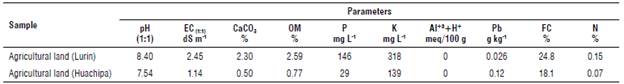 The existence of heavy metals, such as lead (Pb), in agricultural soils is mainly due to irrigation with contaminated water (Méndez et al., 2009). Additionally, the use of pesticides, such as Pb arsenate, in Peruvian agriculture (Iannacone et al., 2009) until its ban in 2013 (MINAM, 2013) and the atmospheric deposition of industrial and vehicular air particles are some of the causes of the presence of these metals in the soil (Nolasco, 2001; Bellido, 2018).