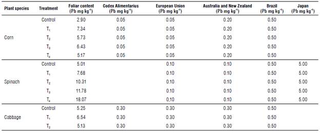 In corn, spinach and cabbage, all treatments including the control exceeded the MPL for Pb (Tab. 10) of the Codex Alimentarius (0.05 mg kg-1 for corn and 0.3 mg kg-1 for cabbage) and other countries (0.1 mg kg-1 for spinach for the European Union, Australia and New Zealand, 0.5 mg kg-1 for Brazil, and 5 mg kg-1 for Japan). It should be noted that, in the control, Pb was not applied in the form of Pb acetate. Still, the soil already contained 0.026 mg kg-1 (a concentration lower than the MPL for Pb in agricultural land for Peruvian legislation) in the soil of the farm that was used to make the greenhouse substrate.