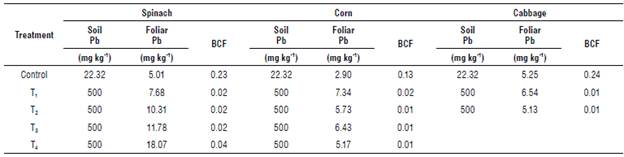 The BCF values were less than 1 in all the treatments for spinach, corn, and cabbage that indicate that these plants are not considered efficient accumulators of Pb (Tab. 11).