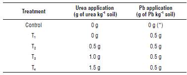 The soil chosen for the substrate was from the district of Lurin because the concentration of Pb was below the environmental quality standard (EQS) of Peru for agricultural land (0.07 g kg-1). In contrast, the soil from Huachipa had a Pb concentration above the EQS of Peru for agricultural land. The greenhouse substrate was mixed with the respective concentration of Pb (0.5 g Pb kg-1 of soil) in a plastic container. The contaminant used was Pb acetate, and the urea doses were added to the substrate according to the treatments listed in Table 2.