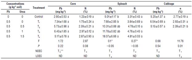 Effect of urea on lead absorption in corn (Zea mays L), spinach (Spinacia olerácea L.) and cabbage (Brassica olerácea L.)