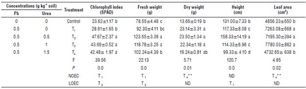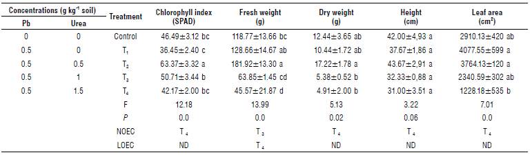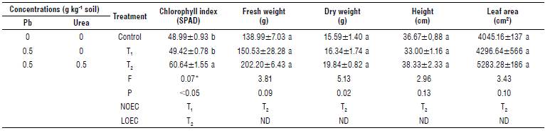 We observed that Pb increased the dry weight in corn and decreased the fresh and dry weights and leaf area in spinach (T4). Likewise, urea increased the values of chlorophyll in corn, spinach, and cabbage, indicating that urea influences the absorption of Pb in the leaf structure in the three plant species under study.