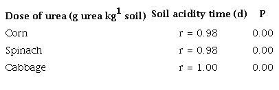 In corn and spinach, we determined that there was a direct relationship between the dose of urea and the acidity time of the soil, and an indirect relationship between the dose of urea and the pH value, which means that urea influenced soil acidification.