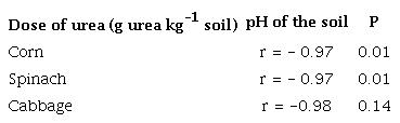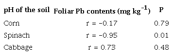 We observed that the urea dose had a direct relationship with the acidity time of the soil for corn, spinach, and cabbage, and the urea dose had a negative relationship with the soil pH for corn and spinach (Tabs. 7 and 8). We also observed that the soil pH had a negative correlation with foliar Pb contents only for spinach (Tab. 9).