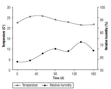 During seed storage there was a reduction in temperature and an increase in the relative humidity of the air due to the approach of the winter period. The temperatures during seed storage varied between 21.4°C and 26.8°C, with a mean temperature of 23.3°C. The relative humidity showed values between 56% and 72% with an average of 62%.