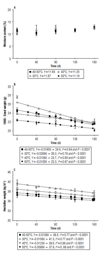 Laboratory analyses were carried out immediately after drying and later every 45 d, defining five evaluation moments (0, 45, 90, 135, and 180 d). The moisture content, 1000-seed weight, hectoliter weight, electrical conductivity, and germination were analyzed. Seed vigor was determined by the tests of the first germination count, the germination speed index, accelerated ageing and the shoot length.