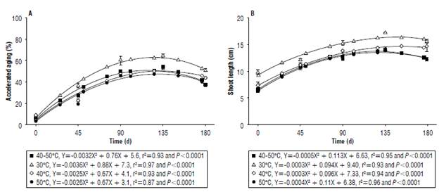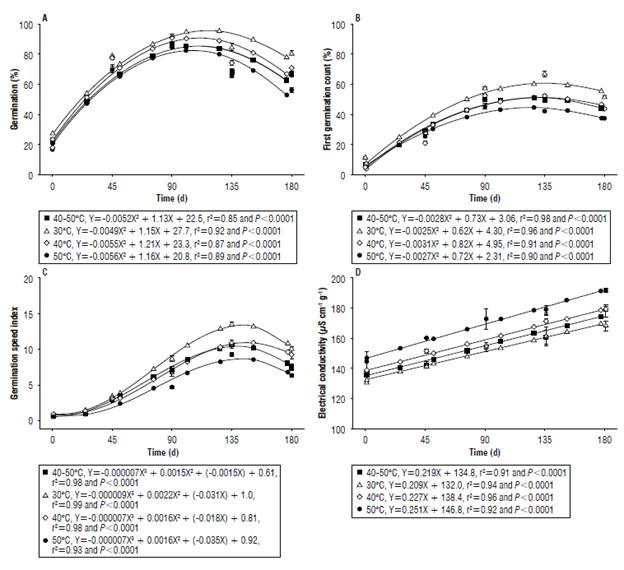 Seed germination throughout storage showed similar behavior for the drying temperatures that were studied. The increase in the values was observed for up to 90 d of storage with a subsequent reduction due to the degrading and ageing of seeds (Fig. 3A). Throughout the experiment the highest germination percentages were obtained from the seeds that were dried at a temperature of 30°C.