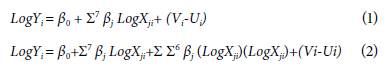 where: Log represents the logarithm base 10; the subscript i represents the ith sample of smallholder farmers; the subscript j represents the number of socio-economic and farm-specific variables;