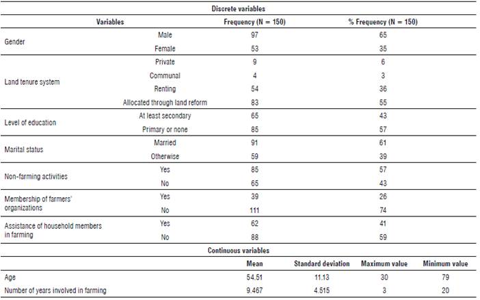 The socio-economic and demographic characteristics of emerging farmers in the North West Province are presented in Table 1. According to Stilwell and Makhura (2004), these characteristics are important because the key household activities are coordinated by the head of the household and decisions of the head are most likely influenced by such demographic characteristics. The results show that the majority (65%) of farmers were males, 61% were married, and 57% had no formal education. The analysis above reveals that participation of women in smallholder farming still remains a challenge in the North West Province. This could be attributed to the fact that most households sampled for the study were made up of more males than females. This finding is consistent with those of Antwi and Oladele (2013) who found that agriculture is mostly reserved for males while women are expected to perform domestic activities in the household. The majority of smallholder farmers in the North West Province are aged between 41 and 60 years, an indication of a paucity of involvement of the youth in smallholder farming agricultural activities in the Province. Smallholder farmers do not have a strong educational background and most of them have no formal education; this could limit their adaptation to new farming agricultural innovations and agricultural infrastructure. This finding is consistent with the results obtained by Montshwe (2006), who found that people with higher levels of education are able to better interpret information. This revelation could be linked to labor costs that have risen in previous years and to the fact that children are being statutorily compelled to be at school during the day. This is also in line with the finding of Harding et al. (2005), who highlighted insufficient family labor as a production constraint of smallholder farming. There is a low number (26%) of people considered as members of farmer groups in the area, posing a threat to organized lending opportunities for farmers.
