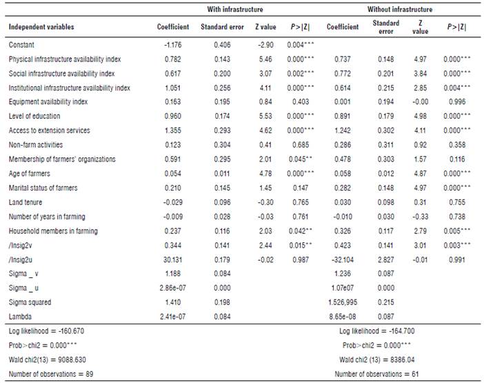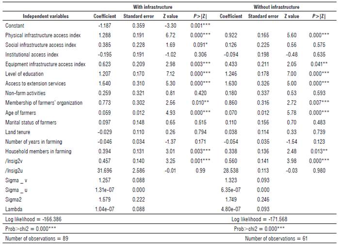 The results of the stochastic frontier models on factors affecting agricultural income with regards to availability and accessibility of infrastructure are presented in Tables 2 and 3, respectively. The models are appropriate given their significant chi-square (P<0.01) and Log likelihood ratios (for both models in Tabs. 2 and 3).
